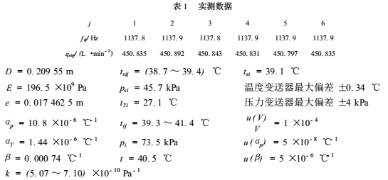 式中:qsi*i校準點在標準體積管處的實際流量,L/min;qsig*i校準點在標準體積管處名義流量的平均值,L/min;D標準體積管的內(nèi)徑,mm;E標準體積管材料的彈性模量,Pa;e標準體積管的壁厚,mm;psi*i校準點在標準體積管處的流體表壓力的平均值,Pa;αp標準體積管的線膨脹數(shù),℃^-1;tsi*i校準點在標準體積管處的流體溫度的平均值,℃;αr體積管測量桿的線膨脹系數(shù),℃^-1;tri*i校準點在體積管測量桿處的溫度,℃。