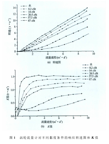 圖1渦輪流量計(jì)對(duì)不同黏度條件的響應(yīng)轉(zhuǎn)速圖和K值
