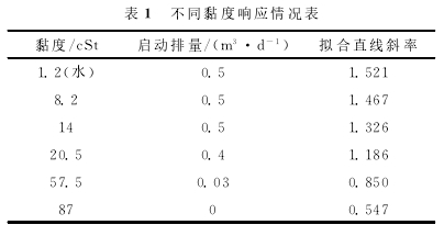 采用水和PAM溶液,在上述實(shí)驗(yàn)平臺(tái)上對(duì)渦輪流量計(jì)在0~10m³/d的范圍內(nèi)的響應(yīng)情況進(jìn)行觀察。通過(guò)調(diào)整配比,得到了純水、8.2、14、20.5、57.5cst和87cst等6種不同表觀黏度的流體并觀察了直徑19mm的渦輪流量計(jì)對(duì)其響應(yīng)的情況。圖1反映了渦輪流量計(jì)在低流量條件下對(duì)不同黏度的流體的響應(yīng)情況。從圖1可見(jiàn),隨著黏度的增加,渦輪流 量計(jì)的K值下降,且線性度也變差。對(duì)圖1中各黏度條件下的響應(yīng)結(jié)果進(jìn)行線性擬合,并結(jié)合實(shí)驗(yàn)中測(cè)量到的啟動(dòng)排量進(jìn)行比較得到表1所示數(shù)據(jù).。