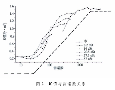 (5)用于測(cè)量不同黏性流體的渦輪流量計(jì),只進(jìn)行一次在高黏度條件下來(lái)流雷諾數(shù)不同的標(biāo)定,即可近似得到該渦輪流量計(jì)K值與雷諾數(shù)的關(guān)系,并反推出該渦輪對(duì)不同黏性流體的響應(yīng)曲線。