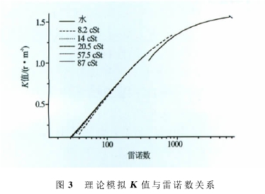 采用Thompson等提出的理論模型,入口速度設(shè)置為層流,對(duì)實(shí)驗(yàn)中的工況進(jìn)行模擬。將求解后得到的K值與雷諾數(shù)的關(guān)系繪制在圖3中。比較圖2與圖3可看出,理論模擬與實(shí)驗(yàn)結(jié)果在前文所述的K值指數(shù)增長(zhǎng)階段與穩(wěn)定階段基本相符,*低雷諾數(shù)條件下穩(wěn)定的小K值難以通過(guò)傳統(tǒng)的理論方法進(jìn)行模擬。理論方法可以作為低流量條件下渦輪流量計(jì)在黏度不超過(guò)50cst的黏性流體中響應(yīng)情況的快速計(jì)算分析手段。通過(guò)理論和實(shí)驗(yàn)表明,在渦輪流量計(jì)進(jìn)入線性段K值穩(wěn)定之前,渦輪K值與雷諾數(shù)呈指數(shù)關(guān)系。不過(guò)需要指出的