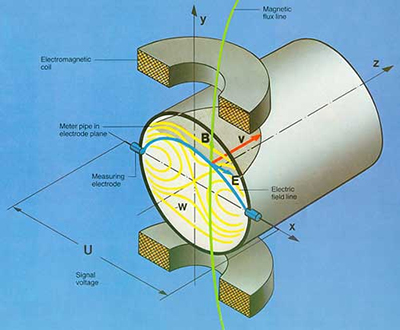 當(dāng)導(dǎo)電液體沿測(cè)量管在交變磁場(chǎng)與磁力線成垂直方向運(yùn)動(dòng)時(shí),導(dǎo)電液體切割磁力線產(chǎn)生感應(yīng)電勢(shì)。在與測(cè)量管軸線和磁力線相互垂直的管壁上安裝了一對(duì)檢測(cè)電*,將這個(gè)感應(yīng)電勢(shì)檢出。