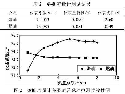 依據(jù)表1測試數(shù)據(jù),經(jīng)計算可得,Φ40流量計在滑油及燃油中測試結(jié)果如表2所示,測試線形圖如圖2所示。