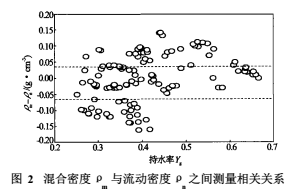 我們希望用測(cè)量的三相流混合密度ρm來(lái)表示流動(dòng)密度ρn,但是,這二者在實(shí)驗(yàn)測(cè)量關(guān)系上呈現(xiàn)復(fù)雜變化關(guān)系(見(jiàn)圖2),需要從多相流流動(dòng)模型出發(fā),依托密度-持水率計(jì)在模擬井中的動(dòng)態(tài)測(cè)量結(jié)果,來(lái)建立確定三相流流動(dòng)密度的數(shù)學(xué)模型。