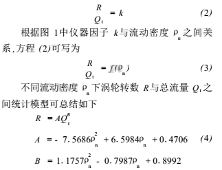 圖1為傘集流條件下渦輪流量計(jì)在油氣水三相流條件下渦輪轉(zhuǎn)速與配比三相流流動(dòng)密度ρn及總流量Qt之間的實(shí)驗(yàn)關(guān)系。油氣水三相流流動(dòng)密度ρn定義