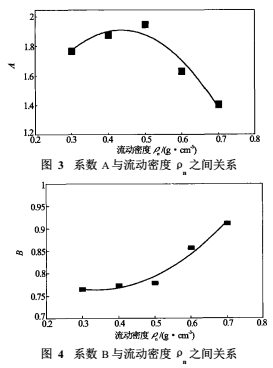 式中,系數(shù)A與B均隨流動(dòng)密度ρm變化,圖3及圖4給出了其實(shí)驗(yàn)擬合關(guān)系。為了從方程(4)中求解得到油氣水三相流總流量,需要根據(jù)密度-持水率計(jì)測(cè)量數(shù)據(jù)確定三相流流動(dòng)密度ρm的數(shù)學(xué)模型。