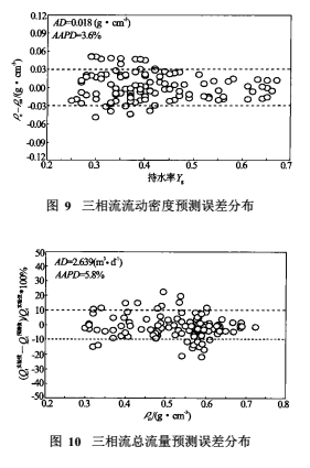 其中,系數(shù)C及D隨含氣率Kg的實(shí)驗(yàn)擬合關(guān)系如圖7及圖8所示。聯(lián)立式(10)、(11)及(12),采用迭代求解法就可以計(jì)算得到三相流流動(dòng)密度值。圖9為計(jì)算得到的流動(dòng)密度與模擬井實(shí)驗(yàn)標(biāo)定的流動(dòng)密度比較結(jié)果??梢钥闯觯^大部分實(shí)驗(yàn)點(diǎn)的流動(dòng)密度預(yù)測(cè)偏差落在-0.03與0.03誤差線之間(圖9中ρnn表示預(yù)測(cè)流動(dòng)密度,ρn為模擬井標(biāo)定流動(dòng)密度),其絕對(duì)平均誤差為AD=0.018g/cm³,絕對(duì)平均相對(duì)誤差為AAPD=3.6%,與圖2所示的實(shí)驗(yàn)關(guān)系相比,其三相流流動(dòng)密度的預(yù)測(cè)精度是令人滿意的。聯(lián)立方程(4)、(10)、(11)及(12)式,采用非線性方程組迭代解法就可以預(yù)測(cè)得到三相流總流量。圖10為預(yù)測(cè)總流量誤差結(jié)果,其絕對(duì)平均誤差為AD=2.639m³/d,絕對(duì)平均相對(duì)誤差為AAPD=5.8%,取得了較高精度的油氣水三相流總流量預(yù)測(cè)結(jié)果。
