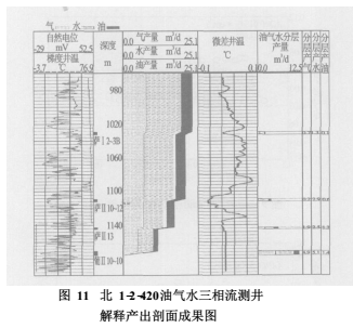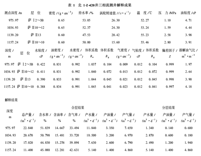 用本文提出的總流量預(yù)測(cè)模型共處理了8口含氣油井的三相流測(cè)井資料。圖11為北1-2-420井三相流測(cè)井資料處理實(shí)例,其解釋結(jié)果見(jiàn)表1。經(jīng)對(duì)8口含氣油井的實(shí)際處理效果表明,傘集流三相流測(cè)井組合儀可以較準(zhǔn)確地確定油井油氣水三相流產(chǎn)出剖面。