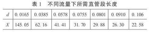 3.直管段長(zhǎng)度和供暖水流量計(jì)精度的初步預(yù)測(cè)在工程設(shè)計(jì)中,根據(jù)流體性質(zhì)、流量和雷諾數(shù)確定α和d值。這樣,按照式(5)就可以依不同的流量計(jì)精度要求,對(duì)直管段長(zhǎng)度進(jìn)行初步預(yù)測(cè),或確定直管段長(zhǎng)度后,對(duì)流量計(jì)的精度做初步預(yù)測(cè)。當(dāng)δ= 0.2%時(shí),不同流量下所需直管段長(zhǎng)度見表1。