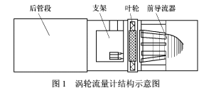 渦輪流量計結構示意圖如圖1所示,主要組件包括前導流器、葉輪、支架以及后管段。流體從機殼進口流入,*先經過前導流器,前導流器對流體流動有如下兩個重要作用: