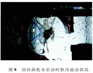 如圖8所示,記錄的是未啟動(dòng)時(shí)切向渦輪內(nèi)的流場,水從圖8左側(cè)流入渦輪,從右側(cè)流出,實(shí)驗(yàn)時(shí)水的流速很低(0.05m3/d),腔體1中的流動(dòng)可近似看作不可壓縮無旋繞角流動(dòng),此時(shí)流體在腔體1中的速度可看成對稱分布,由伯努利方程算得的壓強(qiáng)也是對稱分布,此時(shí)2個(gè)壁面幾乎沒有壓強(qiáng)差,所以渦輪未啟動(dòng)。