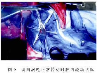 圖9記錄的是切向渦輪正常轉(zhuǎn)動(dòng)時(shí)的流場,圖9中水從左向右流動(dòng),實(shí)驗(yàn)時(shí)水速較快(1m3/d),渦輪葉片順時(shí)針轉(zhuǎn)動(dòng)。水速變大后,擾動(dòng)變大,不再是無旋繞角流動(dòng),腔體1中流體形成一個(gè)運(yùn)動(dòng)的旋渦,導(dǎo)致腔內(nèi)壓強(qiáng)分布不再對稱,產(chǎn)生壓差,致使渦輪葉片轉(zhuǎn)動(dòng),旋渦在隨葉片運(yùn)動(dòng)到腔體2中時(shí)逐漸耗散消失。數(shù)值仿真的計(jì)算結(jié)果與物理實(shí)驗(yàn)的結(jié)果基本一致。