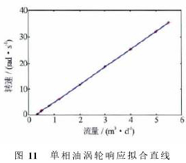 采用同樣的方法,對單相油條件下渦輪響應(yīng)規(guī)律進(jìn)行研究(見圖11),測得單相油的啟動(dòng)排量為0.08m3/d。對單相油的實(shí)驗(yàn)結(jié)果進(jìn)行擬合,可得單相油的響應(yīng)曲線為ω=6.73Q-6.72。與水對比而言,油的擬合曲線斜率更大,即隨著流量增加轉(zhuǎn)速增加得略快。