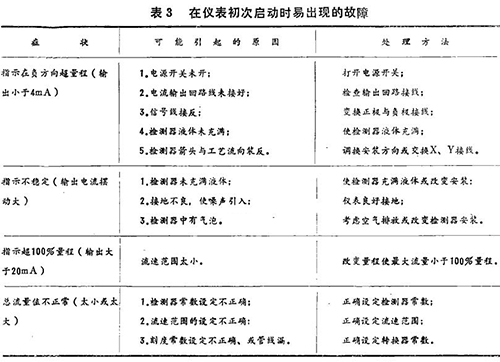 在儀表指示不正常時,可根據(jù)下面介紹的一些典型故障和處理方法進(jìn)行必要的處理。這些故障可分為啟動時易產(chǎn)生的故障,正常運行時出現(xiàn)的故障和接地不良引起的故障(見表3、表4)。
