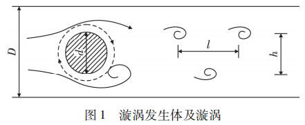 氣體渦輪計(jì)量表是由漩渦發(fā)生體、頻率檢測(cè)器和信號(hào)轉(zhuǎn)換器等環(huán)節(jié)組成,輸出 4 ~ 20 mADC 信號(hào)或脈沖電壓信號(hào)。其測(cè)量原理是在流動(dòng)的流體中的垂直流動(dòng)方向安放 1 根或多根非流體型阻流體,在一定的流量范圍內(nèi),流體在阻流體兩側(cè)交替地分離、釋放出 2 串頻率正比于管道內(nèi)的平均流速、規(guī)則的、不對(duì)稱有規(guī)律的交替漩渦列,如圖 1 所示,且兩側(cè)漩渦旋轉(zhuǎn)方向相反。采用檢測(cè)元件測(cè)出漩渦頻率就可以推算出流體的流量。