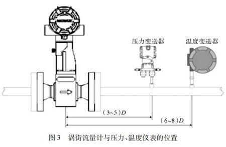 氣體渦輪計(jì)量表的口徑如果與工藝管道相同,不能滿足流量?jī)x表要求時(shí),或者在此流速下測(cè)量準(zhǔn)確度不能保證時(shí),需要縮小儀表口徑,從而提高管內(nèi)流速,保證測(cè)量精度。上下游必須有足夠的直管段,若傳感器安裝點(diǎn)的上游在同一平面上有 2 個(gè) 90°彎頭時(shí),上游直管段≥25D,下游直管段≥5D。根據(jù)測(cè)量的需要,需在氣體渦輪計(jì)量表附近測(cè)量壓力和溫度時(shí),測(cè)壓點(diǎn)應(yīng)在傳感器下游的( 3 ~ 5) D 處,測(cè)溫點(diǎn)應(yīng)在傳感器下游的( 6 ~ 8) D 處,如圖 3 所示。