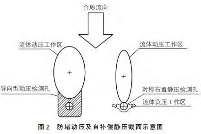 新智能液體渦輪流量表采用拋物面導(dǎo)向型結(jié)構(gòu)作為動(dòng)壓測(cè)點(diǎn),采用對(duì)稱自補(bǔ)償型式的靜壓測(cè)點(diǎn),可以有效地解決來(lái)流方向偏流時(shí)信號(hào)的穩(wěn)定采集,來(lái)流偏離管道軸線時(shí),可以維持輸出差壓基本不變,如圖2所示。