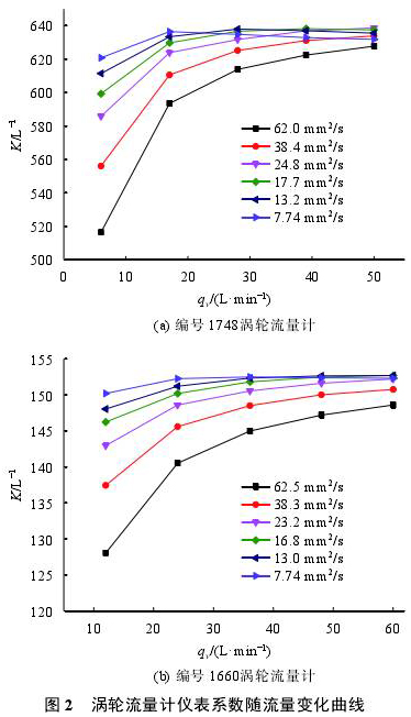 研究利用航空潤滑油流量標(biāo)準(zhǔn)裝置在20,30,40,50,60,80℃對10支成品油計(jì)量表進(jìn)行校準(zhǔn)試驗(yàn)。CL-10型流量計(jì)校準(zhǔn)流量點(diǎn)分別為6,17,28,39,50L/min;CL-15型流量計(jì)校準(zhǔn)流量點(diǎn)分別為12,24,36,48,60L/min。圖2是1748和1660兩支成品油計(jì)量表在各粘度點(diǎn)儀表系數(shù)隨流量變化曲線。
