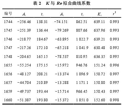 利用雙指數(shù)衰減函數(shù)對儀表系數(shù)與雷諾數(shù)關(guān)系進(jìn)行擬合,在層流范圍內(nèi)(Re<2300),儀表系數(shù)隨Re增加迅速增加,尤其是在Re<1000范圍內(nèi)更加明顯;而在Re>3000紊流范圍內(nèi),儀表系數(shù)變化平緩,接近常數(shù);在1000