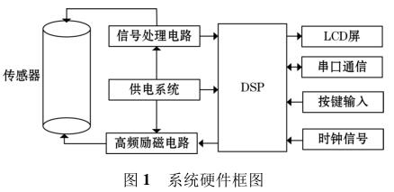 高頻勵(lì)磁自來水流量計(jì)由傳感器、高頻勵(lì)磁電路、信號(hào)處理電路等組成,其中高頻勵(lì)磁電路決定著傳感器磁場(chǎng)的強(qiáng)弱,勵(lì)磁電路的穩(wěn)定性以及精確性決定著系統(tǒng)檢測(cè)的準(zhǔn)確性以及穩(wěn)定性。DSP 系統(tǒng)控制勵(lì)磁電路激勵(lì)傳感器線圈,當(dāng)線圈中有導(dǎo)電液體流過時(shí),其切割磁感線并在傳感器兩端的線圈上產(chǎn)生感應(yīng)電動(dòng)勢(shì),利用信號(hào)檢測(cè)電路監(jiān)測(cè)感應(yīng)電動(dòng)勢(shì)的大小,*后根據(jù)相應(yīng)關(guān)系計(jì)算出液體的流量,系統(tǒng)硬件框圖如圖 1 所示。