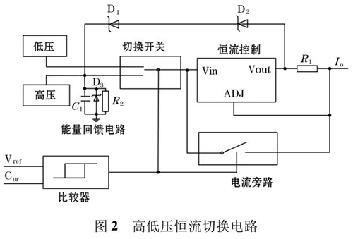 高頻勵(lì)磁電路主要由高低壓切換恒流控制電路和H 橋勵(lì)磁開關(guān)電路組成。其中高低壓切換恒流控制電路確保高壓或低壓情況,都可以通過 H 橋向勵(lì)磁線圈提供恒定的電流。電路原理圖如圖 2所示。