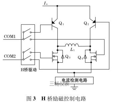 由圖 3 可知,I o 為高低壓切換恒流控制電路輸出的恒流源電流,H 橋驅(qū)動(dòng)的 COM1 端控制三*管 Q 1和場(chǎng)效應(yīng)管 Q 4 的通斷;COM2 端控制三*管 Q 2 和場(chǎng)效應(yīng)管 Q 3 的通斷。L 1 表示的是勵(lì)磁線圈(傳感器中線圈),COM1、COM2 為正交的 PWM 波信號(hào),因此在勵(lì)磁線圈 L 1 的兩端會(huì)產(chǎn)生方波勵(lì)磁信號(hào)。檢流電路主要是用來檢測(cè)勵(lì)磁線圈中電流的變化,當(dāng)線圈中的勵(lì)磁電流方向變化時(shí),可以及時(shí)將此信息反饋給高低壓切換恒流控制電路中的比較器,從而實(shí)現(xiàn)切換高低壓源達(dá)到恒流控制的目的。