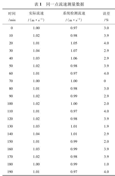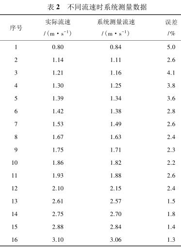 由表 2 測(cè)量數(shù)據(jù)可知,系統(tǒng)在測(cè)量低流速液體時(shí)(流速小于 1 m/s)誤差較大,達(dá)到 5%,當(dāng)待測(cè)液體的流速增大時(shí)(大于 1.4 m/s),誤差逐漸減小,基本維持在 3%以內(nèi)。由此可見系統(tǒng)具有較高的檢測(cè)精度,尤其是當(dāng)管道中的液體流速較高時(shí),系統(tǒng)的檢測(cè)誤差不超過 3%,達(dá)到了設(shè)計(jì)預(yù)期。