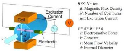 基本上,當導電液體流過磁場時,會感應出電壓。為了測量該產(chǎn)生的電壓(與流動的液體的速度成正比),使用了兩個彼此相對安裝的不銹鋼電*。