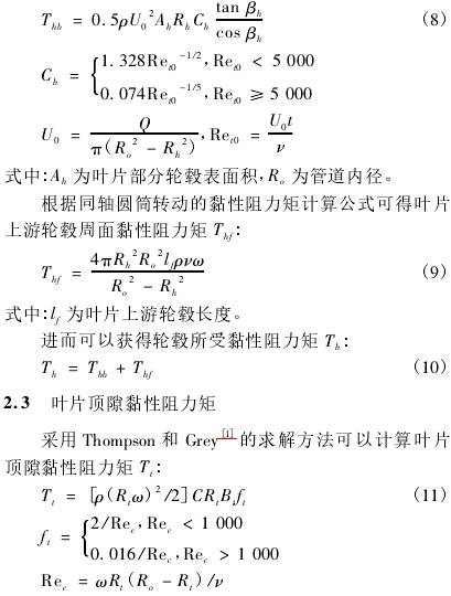 式中:Td為葉片驅(qū)動力矩;Th為輪轂周邊黏性阻力矩;Tt為葉片頂隙黏性阻力矩;Tw為輪轂端面黏性阻力矩;Tb為軸承黏性阻力矩;Tm為軸與軸尖機械阻力矩