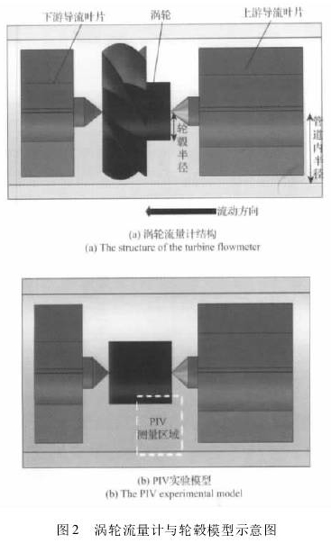 實驗在中國科大水平循環(huán)水實驗平臺上進行,實驗采用20mm口徑的柴油計量表,量程范圍是1~80方/天,其中較好線性段范圍是5~50方/天,流量計渦輪為等重疊度渦輪(不同半徑位置葉柵重疊度相同),具體參數(shù)如表1所示,這種流量計在大慶油田的生產(chǎn)測井中廣泛應(yīng)用,其結(jié)構(gòu)如圖2(a)所示。來流經(jīng)過一段導流葉片整流后進入渦輪的環(huán)空空間,驅(qū)動葉輪轉(zhuǎn)動,輸出響應(yīng)信號。在柴油計量表的線性響應(yīng)區(qū)間中,處于穩(wěn)定轉(zhuǎn)動時渦輪葉片對流體的干擾較少,相對來流攻角較小,對流體的軸向速度分布基本沒有影響,僅會稍稍增加其周向轉(zhuǎn)速。因而為了測量柴油計量表入口速度分布,特別制作了各參數(shù)與實際渦輪相同但并無葉片的透明外殼輪轂?zāi)P?,如圖2(b)所示,通過PIV手段,對管道中軸面上輪轂和管壁之間的區(qū)域的軸向速度分布進行剖面測量。輪轂?zāi)P桶惭b在待測柴油計量表的上游,相距超過2m以保證二者之間無相互干擾。實驗流速范圍在5~25方/天,在管路下游采用時間-質(zhì)量法獲得真實流速,通過光學觀測獲得柴油計量表葉輪的真實轉(zhuǎn)動頻率,同時采用PIV技術(shù)測量輪轂?zāi)P椭械乃俣确植肌?br />