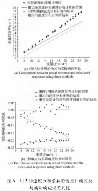 分別計算各個響應(yīng)在不同流量點處與真實響應(yīng)的相對誤差,結(jié)果如圖6(b)所示。從圖中可以明顯看出,用PIV獲得的速度分布計算的結(jié)果與實際響應(yīng)的相對誤差*小,在3%以內(nèi);用均勻入口速度分布計算的結(jié)果誤差*大;用完全發(fā)展的環(huán)形通道速度分布當雷諾數(shù)超過2000時,由于計算模型假設(shè)由層流的速度分布直接轉(zhuǎn)變?yōu)橥牧鞯乃俣确植寄P?,未能合理地反映實際流動中逐步轉(zhuǎn)變的過渡階段,導致理論結(jié)果與實際速度分布有較大差異,所以誤差較大。通過這些對比不難看出,獲得真實的速度分布能更為準確地計算柴油計量表的實際響應(yīng)。面對復(fù)雜的上游來流條件,PIV結(jié)果更能反映柴油計量表內(nèi)部流動的主要特征,這也從另一個側(cè)面表明,對柴油計量表內(nèi)部復(fù)雜流動的精細測量和深入認識也將是完善相關(guān)理論和進一步優(yōu)化其性能的重要途徑。