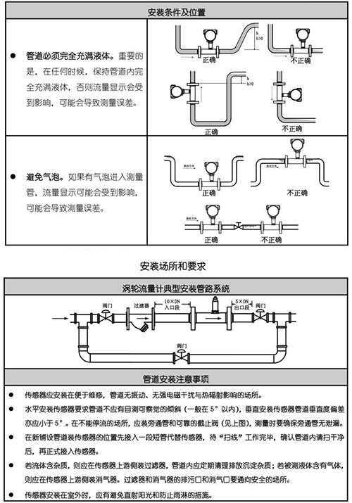 渦輪流量傳感器可水平、垂直安裝,垂時流體方向必須向上。液體應充滿管道,不得有氣泡。安裝時,液體流動方向應與傳感器外殼上指示流向的箭頭方向一致。直管段內壁應光滑清潔,無凹痕、積垢和起皮等缺陷。