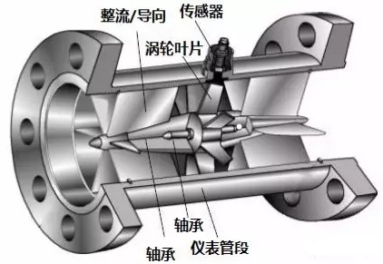 下圖就是一款液體渦輪流量計(jì)的透視圖,可以看到流量計(jì)的管道中心安放了一個(gè)渦輪,渦輪兩端由軸承支撐。