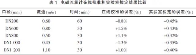 近幾年來(lái),通過(guò)一系列的現(xiàn)場(chǎng)試驗(yàn),利用上述方法對(duì)液體流量計(jì)進(jìn)行在線的校準(zhǔn),取得了比較可信的結(jié)果。表1顯示了對(duì)不同口徑規(guī)格的電磁流量計(jì)進(jìn)行在線校準(zhǔn)的示值誤差結(jié)果和實(shí)驗(yàn)室標(biāo)準(zhǔn)裝置上檢定結(jié)果的比較情況: