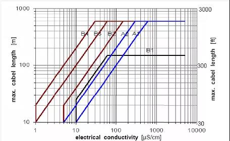 以某品*污泥流量計選型樣本提供的電導(dǎo)率和電纜長度曲線為例,其中A型電纜為雙芯雙屏蔽DS300、B型電纜為雙芯三屏蔽BTS300。像浙江省一般水庫原水電導(dǎo)率在100us/cm左右,安裝所需電纜線小于100米,選A型即可,超過100米,需要選B型。