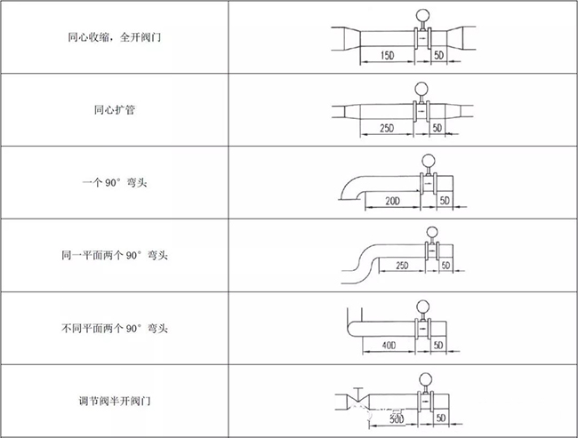 1)測(cè)量混合相流體時(shí),選擇不會(huì)引起相分離的場(chǎng)所;測(cè)量雙組分液體時(shí),避免裝在混合尚未均勻的下游;測(cè)量化學(xué)反應(yīng)管道時(shí),要裝在反應(yīng)充分完成段的下游;