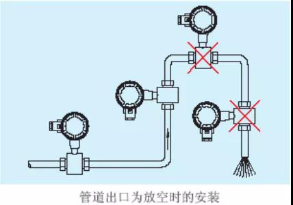 確保流量傳感器在測量時,管道中充滿被測流體,不能出現(xiàn)非滿管狀態(tài)。如管道存在非滿管或是出口有放空狀態(tài),傳感器應安裝在一根虹吸管上。