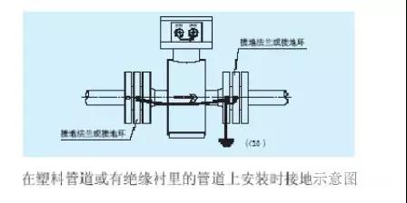 b.傳感器在塑料管道上或在有絕緣襯里的管道上安裝,傳感器的兩端應安裝接地環(huán)、或接地法蘭、或帶有接地電*的短管,按下圖接地。使管內(nèi)流動的被測介質(zhì)與大地短路,具有零電位,否則,補水流量計無法正常工作。