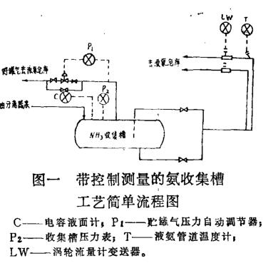 衛(wèi)生型液體渦輪流量計(jì)安裝在氨收集槽液氨管道上,帶控制測(cè)量的氨收集槽工藝簡(jiǎn)單流程是:當(dāng)320kg/cm2液氨送入收集槽,降壓到16kg/cm2,氨在收集槽內(nèi)進(jìn)行氣液相分離,分離后的貯罐氣送出管路,分離后的液氨,經(jīng)液氨管道送到液氨倉(cāng)庫(kù)(如‘圖一所示)