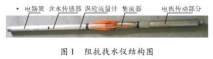 阻抗找水儀結構如圖 1 所示,它主要由含水率計和產(chǎn)量計兩部分組成。含水率計部分主要由電路筒、含水率傳感器組成。產(chǎn)量計部分主要由dn50液體渦輪流量計、集流器及電機傳動部分組成。