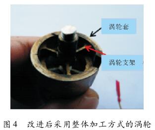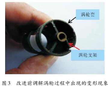 在對影響儀器流量測量的調(diào)查中發(fā)現(xiàn),dn50液體渦輪流量計支架不同心。dn50液體渦輪流量計是阻抗找水儀流量測量的核心部件,采用的加工方式是先加工渦輪上下支架再焊接在渦輪套上,因此渦輪上下支架不容易保持同心,影響了支架上渦輪葉片轉動的靈活性,導致流量測量時啟動排量達 3 ~ 5 m 3 /d,高于技術文件上規(guī)定的 2 m 3 /d。且由于渦輪支架是焊接在渦輪套上的,在測井過程中常出現(xiàn)渦輪支架扭曲變形、開焊而影響測井成功率。改進前調(diào)解渦輪過程中出現(xiàn)的變形現(xiàn)象如圖 3 所示。在2015 年 182 口產(chǎn)出剖面測井中,因此而未測成的井數(shù)達 26 口之多,占全年產(chǎn)出剖面測井任務的 14.3% 。
