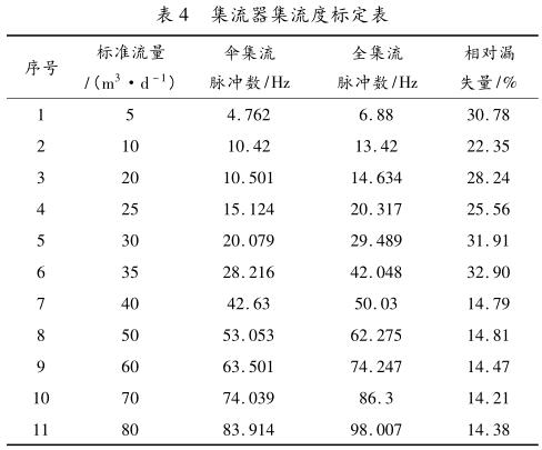從表 4 我們發(fā)現(xiàn),該儀器 40 m 3 /d 流量以上的漏失量相對恒定,低流量漏失量偏大,由此我們判斷該儀器集流器不合格。分析檢查后發(fā)現(xiàn),集流器傘布的綁扎位置出現(xiàn)問題,是導致其低流量漏失偏大的原因,需要重新維修。通過對儀器集流度的檢測,根據(jù)相對漏失量,我們可以很容易地判斷出集流器的集流程度,*大限度地保障了儀器的測量質(zhì)量。
