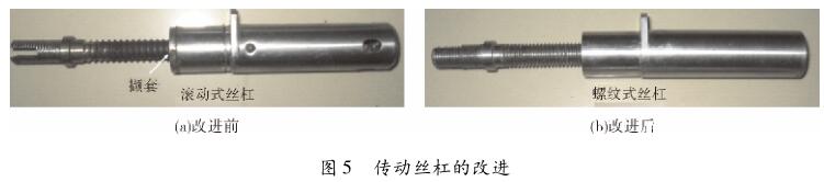 我們對電機傳動絲杠的結構進行了改進,去掉原有的擷套及滾珠,改為 M8 ×1.25 螺紋式,如圖 5(b)所示。改造后的傳動絲杠采用了精加工工藝,研磨度為1.6 ,由于制造精度高,不會增加阻力。與原有的滾珠式電機傳動絲杠相比較,現(xiàn)有的螺紋式電機傳動絲杠不易產(chǎn)生滑扣現(xiàn)象,耐用、可靠。