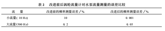 采用測(cè)頻計(jì)數(shù)——測(cè)周計(jì)脈沖法與目前測(cè)頻計(jì)數(shù)法相比,前者遠(yuǎn)遠(yuǎn)小于后者的測(cè)量誤差,采用這種方法不僅測(cè)量精度有保證,且可靠易于實(shí)現(xiàn),可從根本上解決渦輪流量計(jì)對(duì)水泵流量的測(cè)量精度及減小誤差問題。表2是改進(jìn)前后的測(cè)量誤差實(shí)測(cè)對(duì)比。