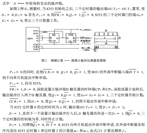 這種方法的硬件電路如圖2所示,包括單片機(jī)8031,可編程定時(shí)器8253以及兩個(gè)D觸發(fā)器。其中t1由一個(gè)8253定時(shí)器0來定時(shí),其值是不變的。檢測(cè)時(shí)間t在t1結(jié)束后,由渦輪流量計(jì)輸出信號(hào)的*一個(gè)脈沖來決定。即t=t1+△t,m1和m2是檢測(cè)時(shí)間t內(nèi)渦輪流量計(jì)發(fā)出的脈沖數(shù)和時(shí)鐘脈沖的計(jì)數(shù)值,T0是一個(gè)脈沖的周期,分別用8253定時(shí)器1和定時(shí)器2進(jìn)行計(jì)數(shù),且t=m2T0,則頻率f 為