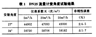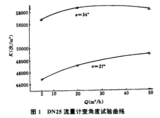 對(duì)DN25流量計(jì)分別做了葉片安裝角a為27°和34°的變角度試驗(yàn),其結(jié)果見(jiàn)表1和圖1。