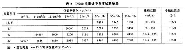對(duì)DN50流量計(jì)分別做了a為13.5°、27°、32°和37°變角度試驗(yàn),其結(jié)果見(jiàn)表2和圖2。