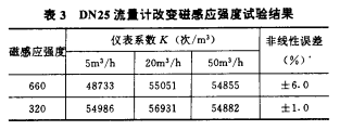 位于流量計(jì)之上,緊貼殼體處安裝著磁電轉(zhuǎn)換器,它將對(duì)渦輪葉片(由鐵磁性材料制成)產(chǎn)生一個(gè)恒定的磁性阻力矩。無(wú)論葉片處在靜止或轉(zhuǎn)動(dòng)過(guò)程中都將始終受到這一磁力作用。這一磁力將直接影響著流量計(jì)的性能,尤其小流量時(shí)影響更大。為了研究該磁力對(duì)流量計(jì)性能的影響情況,我們選取適當(dāng)?shù)拇鸥袘?yīng)強(qiáng)度,對(duì)同一臺(tái)DN25流量計(jì)進(jìn)行了變磁感應(yīng)強(qiáng)度B的影響試驗(yàn),其試驗(yàn)結(jié)果見(jiàn)表3和圖3。