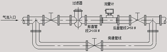 4、為了檢修時不至影響液體的正常輸送,應(yīng)在傳感器兩端的直管段外安裝旁通管道(如圖四);