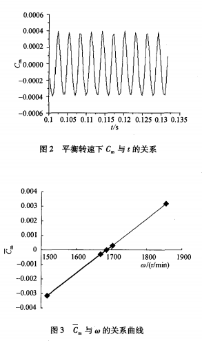 圖2即為葉輪在平衡轉速下旋轉時Cm的周期性變化過程。假定Cm為Cm值在一定計算時間內的平均值,計算時問通常約為一個葉輪軸的旋轉周期。通過計算發(fā)現,Cm基本上與葉輪轉速呈線性比例關系,見圖3。Cm等于零所對應的ω則表示葉輪在此轉速下旋轉達到了力矩平衡。因此在實際計算中,可以選取兩個轉速進行計算,建立Cm與ω的線性關系,然后利用此關系確定葉輪的平衡轉速。當然,預先能對葉輪處于平衡狀態(tài)下的轉速進行估計,縮小設定轉速與平衡轉速的范圍,利用這種方法確定葉輪平衡轉速的精確度將更加高。